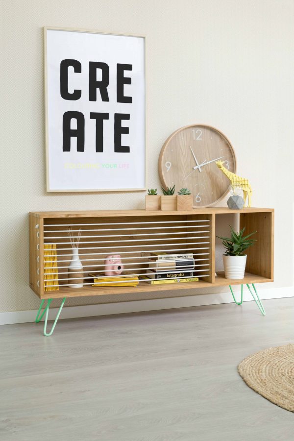 Aparador de estilo nórdico en madera maciza de pino gallego. Las patas de hierro le dan al mueble un aire industrial y puedes elegirlas en negro o en cualquiera de los tres colores LOFTI (rosa, amarillo o verde). Las gomas elásticas te permiten colocar cosas en el interior cómodamente. Fabricado íntegramente en España con barnices y pinturas ecológicos. Disponible con acabado natural o roble.